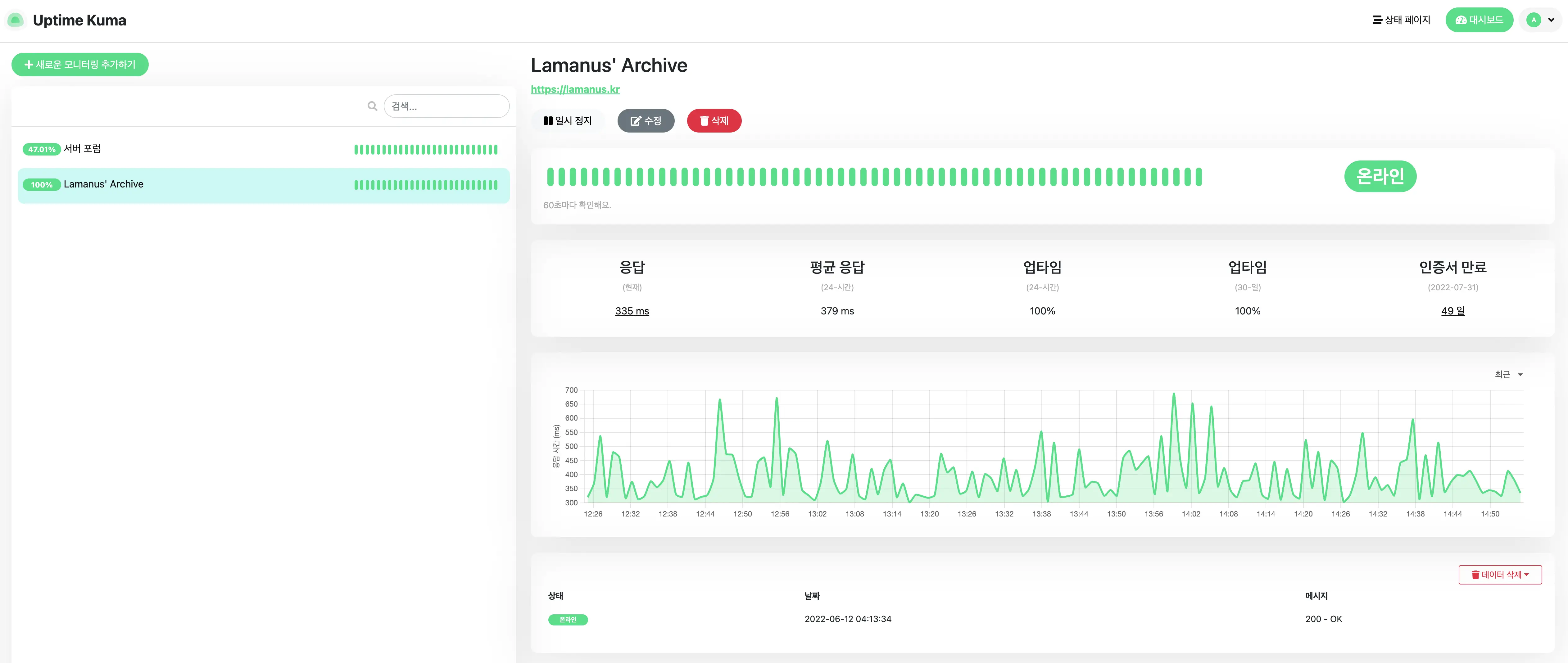 모니터링을 등록하고 나서 텔레그램 알림도 연동을 해봤는데, 다운된 서버가 복구되면서 위와 같이 알림도 잘 전달하고 있습니다. 다양한 알림 설정이 준비되어 있기 때문에 왠만하면 원하는 소프트웨어로 알림을 전달받으실 수 있을 것으로 기대됩니다.