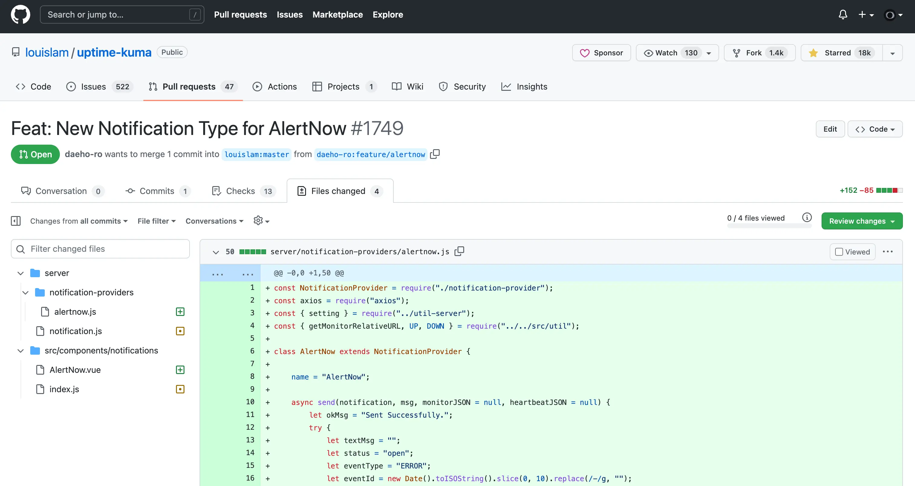 알림 타입을 살펴보다 보니까 회사에서 제공하는 솔루션이 들어가면 좋겠다는 생각이 문득 들었습니다. 그래서 간단하게 코드 추가를 하고 PR을 날려봅니다.