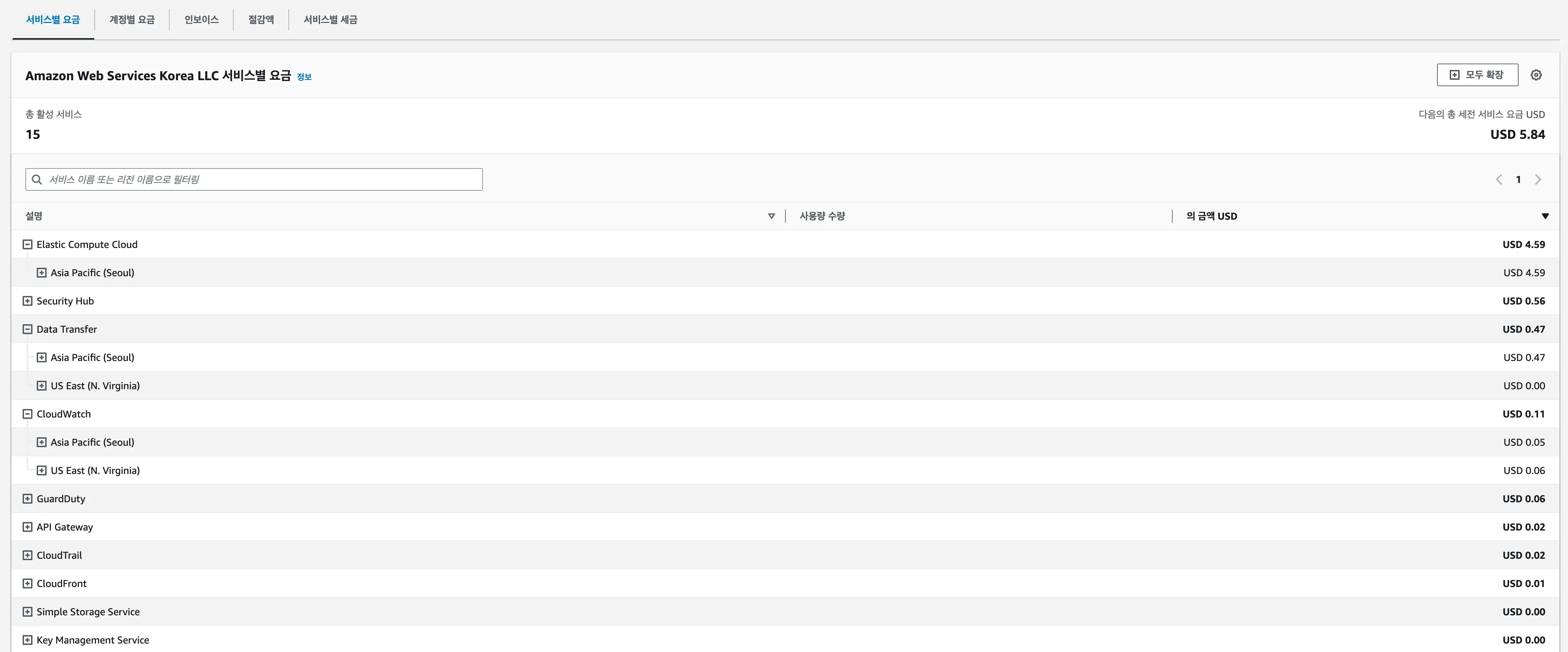 청구서 화면의 하단에 보시면 위와 같이 서비스별 요금을 확인할 수 있는데, 서비스별 요금은 다시 리전별로 구분이 됩니다. 그래서 비용이 발생하고 있는 서비스와 리전을 식별하여, 콘솔의 리전을 변경해가면서 모든 리소스를 삭제하시면 됩니다. 조금 더 구체적인 서비스에 대한 설명은 리전을 다시 확장해보면 사용량 타입까지 구분해주기 때문에 이를 사용하면 됩니다.
