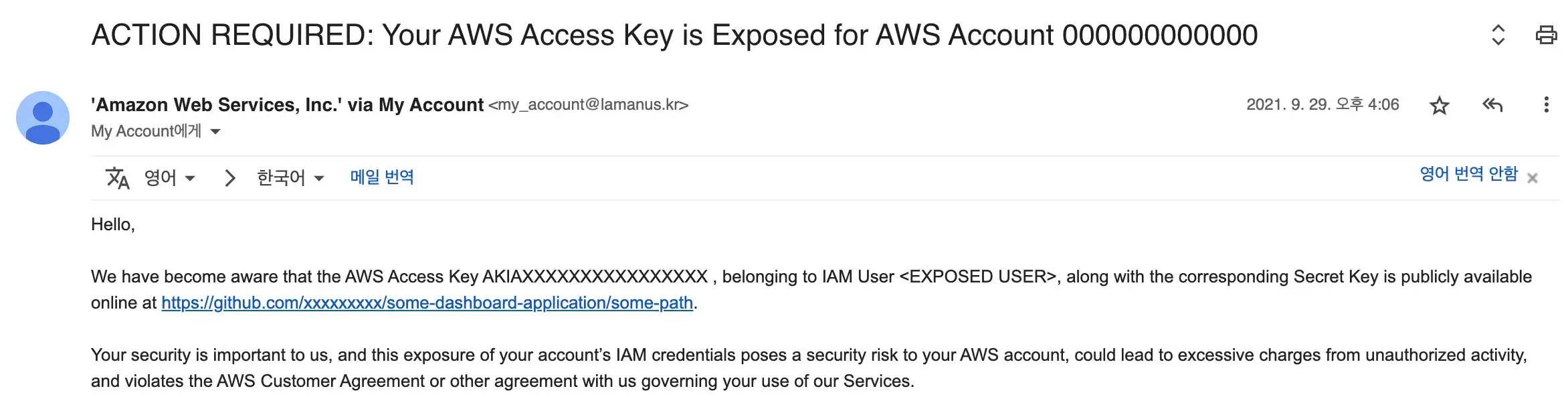 발급한 액세스 키는 철저하게 관리해야 합니다. 액세스 키는 대부분 실수로 유출되는데, 한 번의 노출로 해커들이 장시간 채굴하고 수천만원의 비용이 청구되는 경우가 발생하고 있습니다. 저도 회사에서 여러 고객들이 해킹당한 사례들을 봐왔는데, 모두 액세스 키를 노출해서 발생하였습니다.