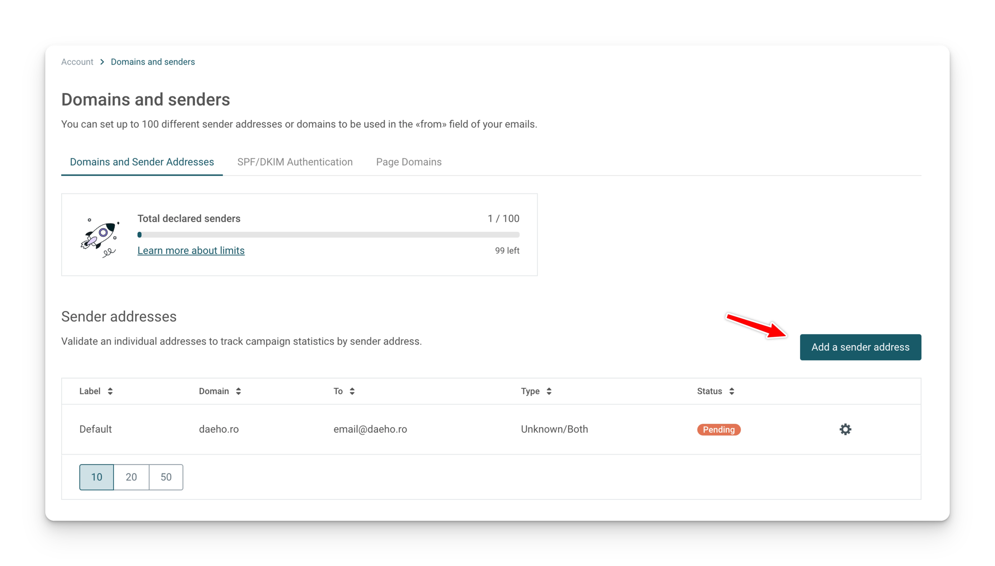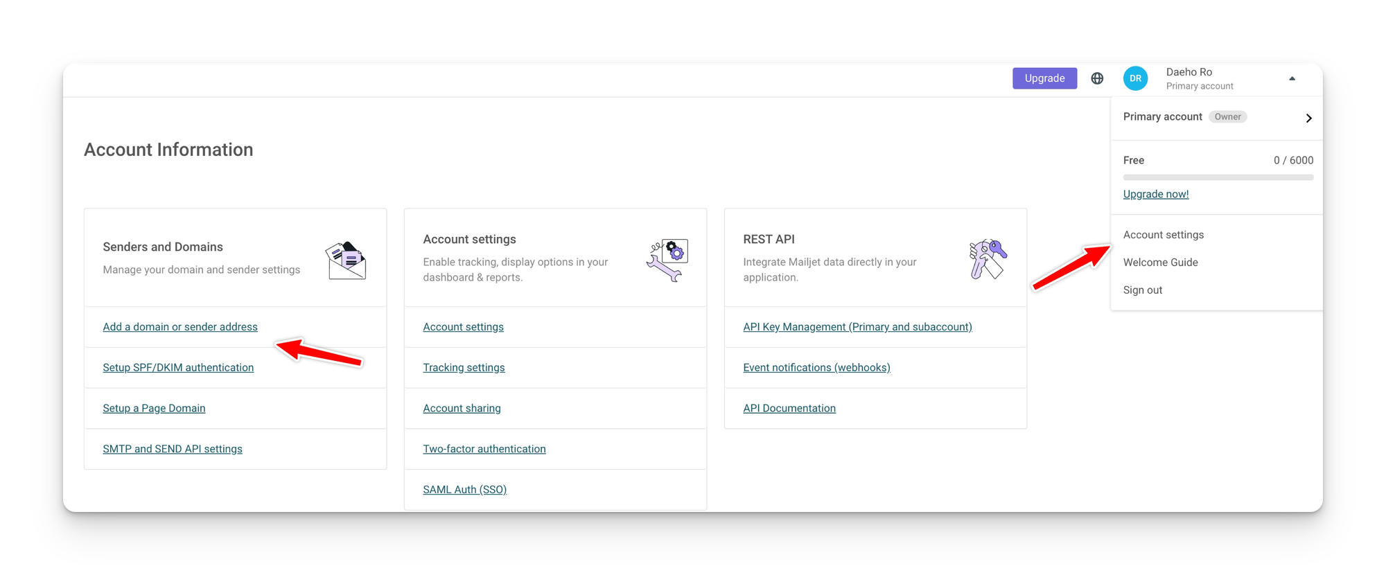 매달 6천건의 이메일 발송(하루 200건 제한)이 가능한 무료 요금제를 선택하도록 한다. 그리고 인증 메일이 발송되면 이메일 인증을 진행하면 된다. 인증이 완료되었으면, 발송 이메일 설정을 진행해야 한다. 우측 상단의 계정 설정으로 진입하여 도메인 또는 발송자 추가 메뉴를 클릭한다.