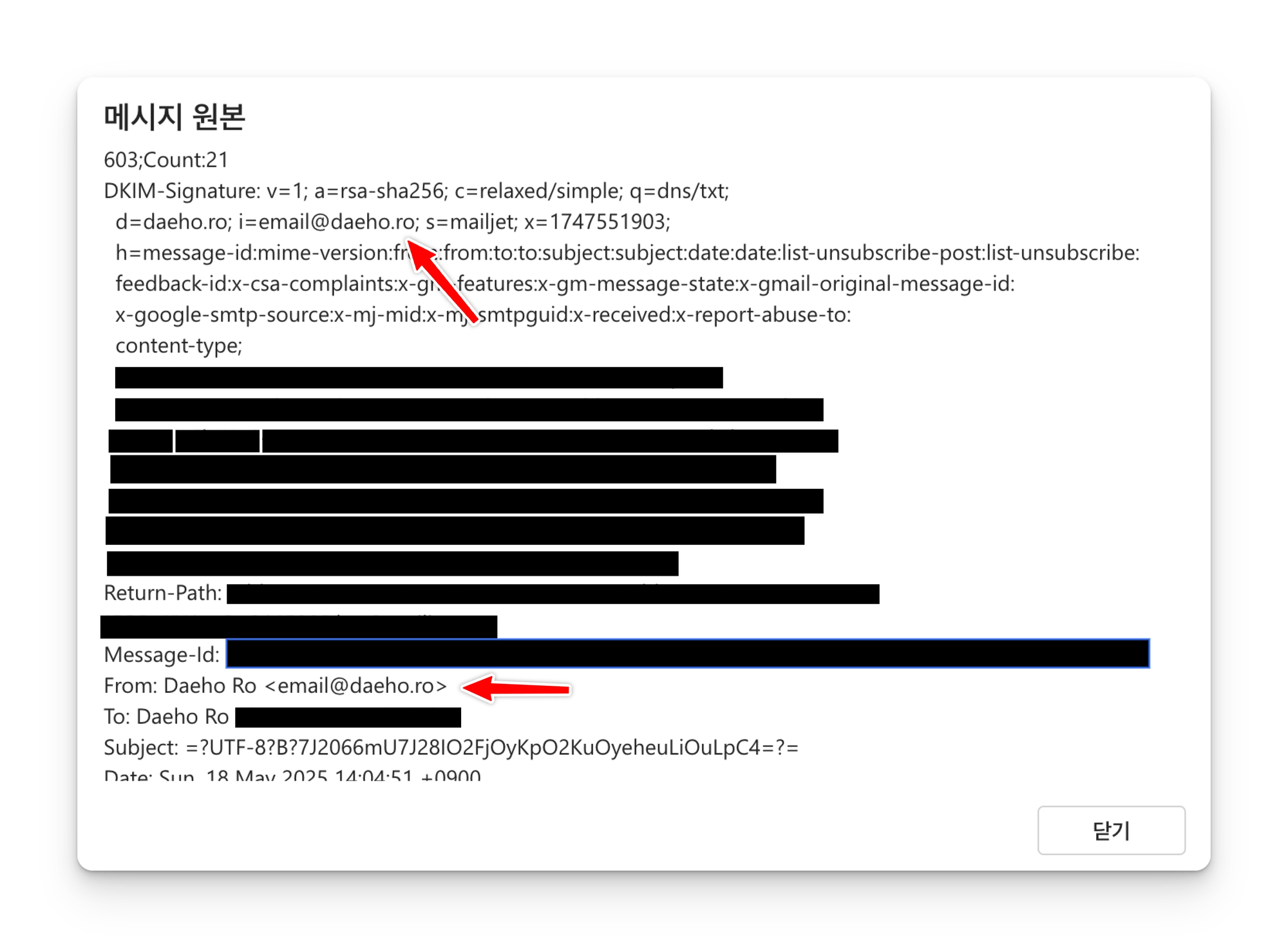 정상적으로 이메일을 수신하였고, 수신된 이메일 원본에서 다음과 같이 발신자가 정상 처리된 것을 확인할 수 있다.