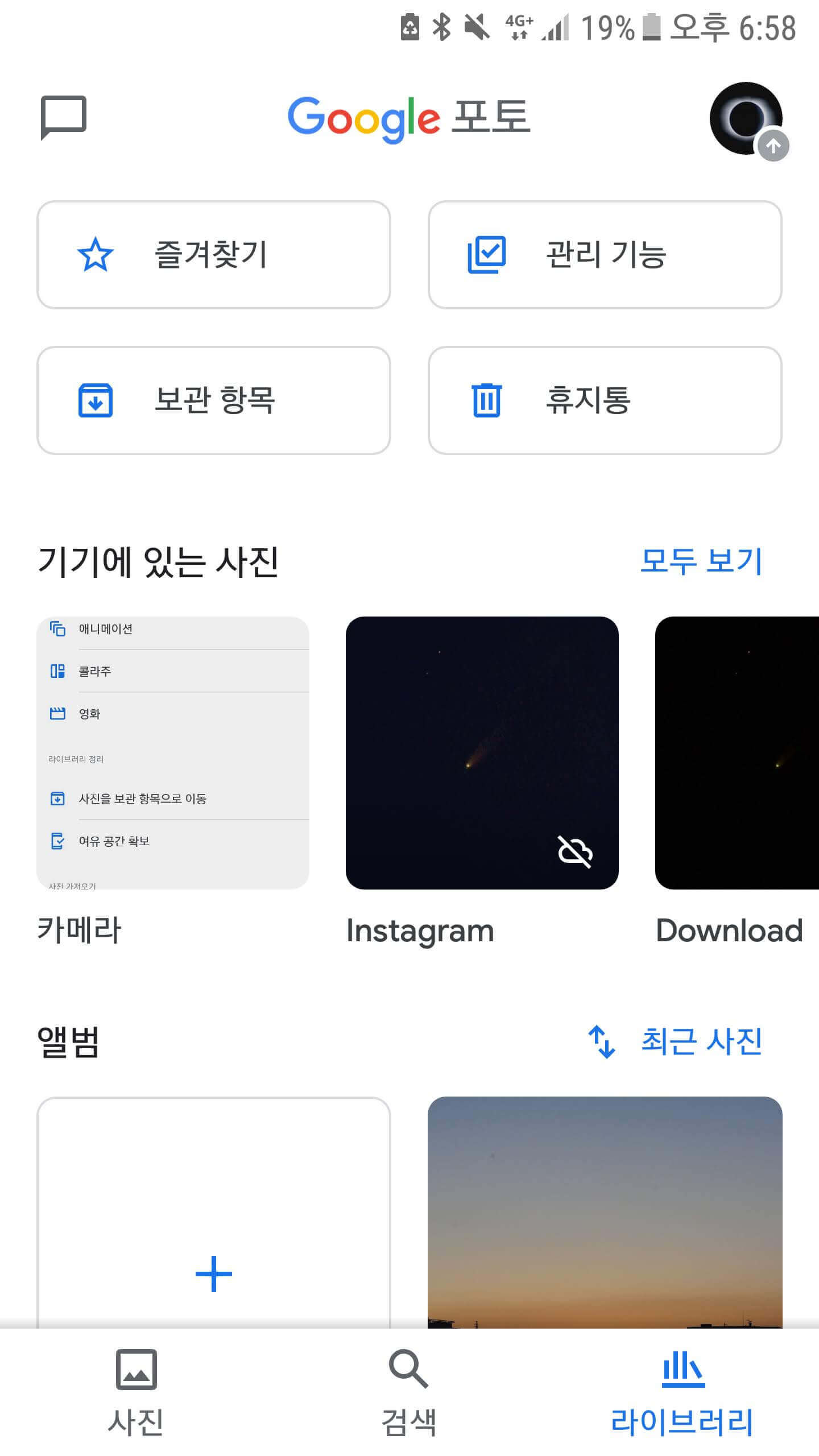 백업 및 동기화 옵션은 우측 상단 프로필을 눌러서 [포토 설정 > 백업 및 동기화]로 들어가시면 됩니다.
