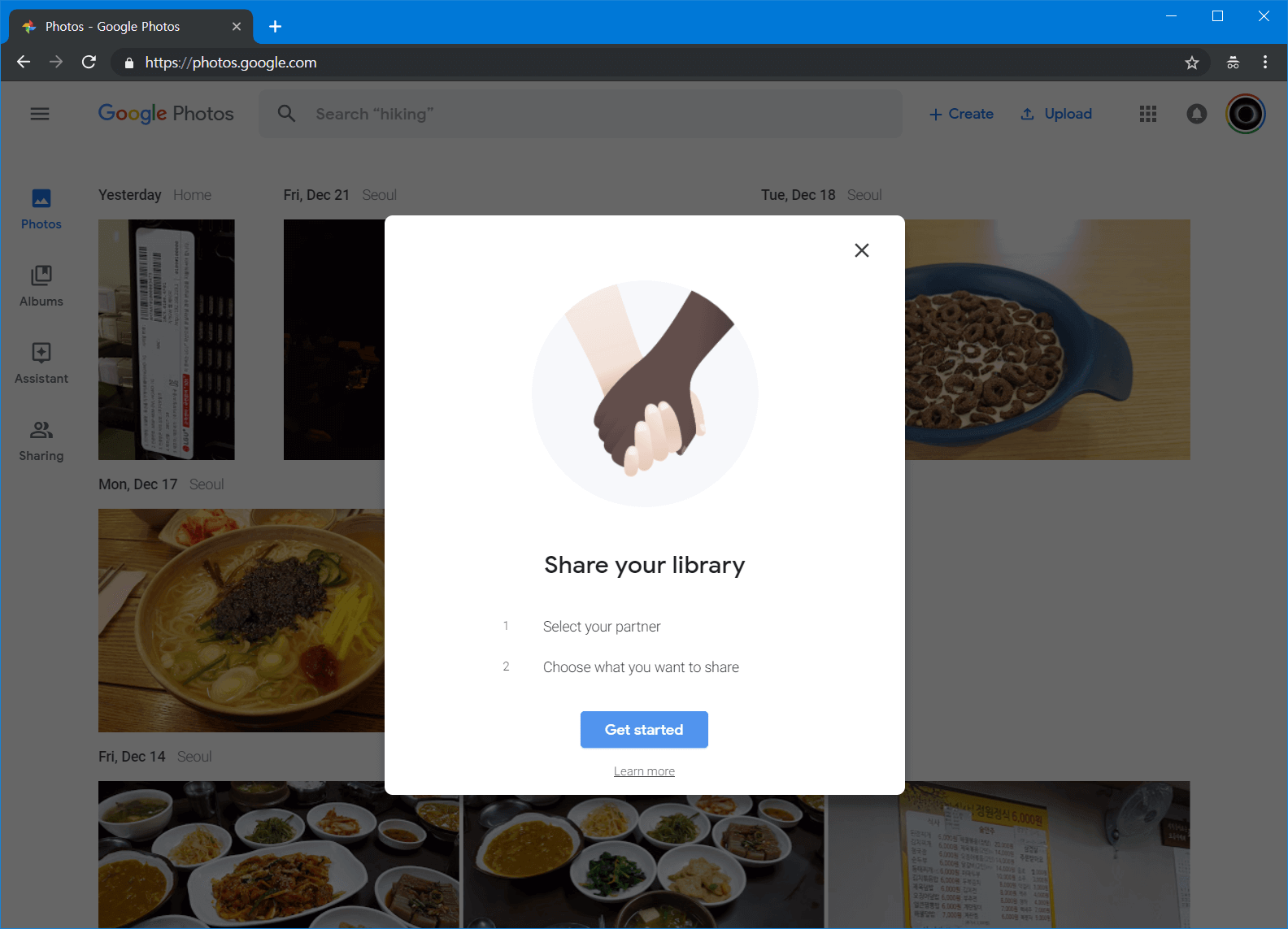 메뉴를 보면 기존 계정이 없음에도 불구하고 사진이 라이브러리에 남았습니다. 이렇게 모든 사진을 기존 계정에서 파트너 계정으로 옮길 수 있습니다.