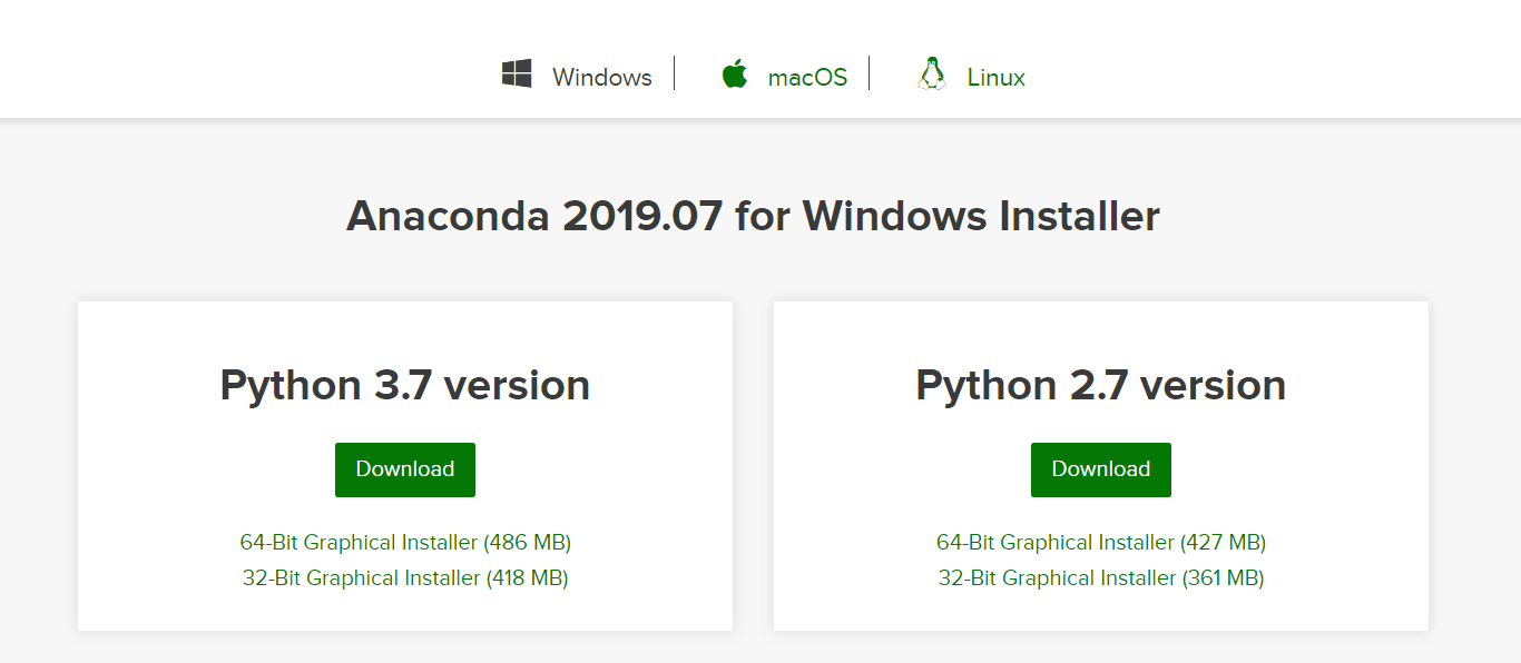 Jupyter Lab의 설치는 아나콘다를 통해서 손쉽게 진행할 수 있습니다. 어차피 Python 3.7도 설치해야 하므로 간편하게 미리 패키징된 아나콘다를 이용합니다. [링크] 아나콘다 다운로드 홈페이지는 기본적으로 Mac OS로 되어 있습니다. Windows 탭을 눌러서 다운로드 합니다.