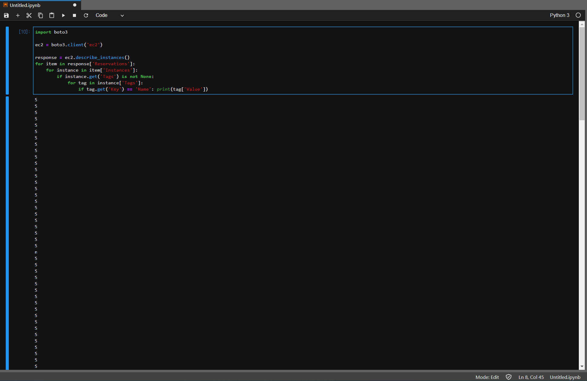 region = ap-northeast-2위와 같이 API 키 값과 지역 (서울)을 설정하면 Boto3 패키지에서 별도의 설정 없이 바로 API 호출이 가능합니다. 물론 해당 API 키가 허용하는 IAM 권한 내의 기능들만 이용할 수 있습니다. 간단한 예로 사용중인 EC2 인스턴스들의 이름을 출력해봅니다.