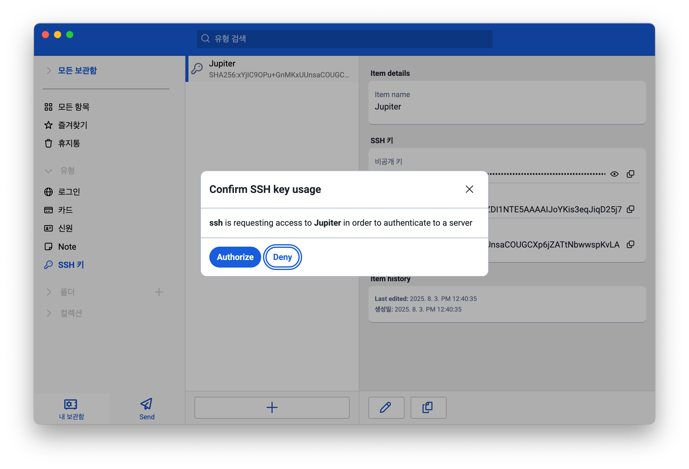 이제 SSH 기능을 테스트 해보도록 하자. 아래 명령을 실행하면 1Password로 연결되고, 거기에서 비밀키를 가져오기 위해서 지문 인증을 요구할 것이다.