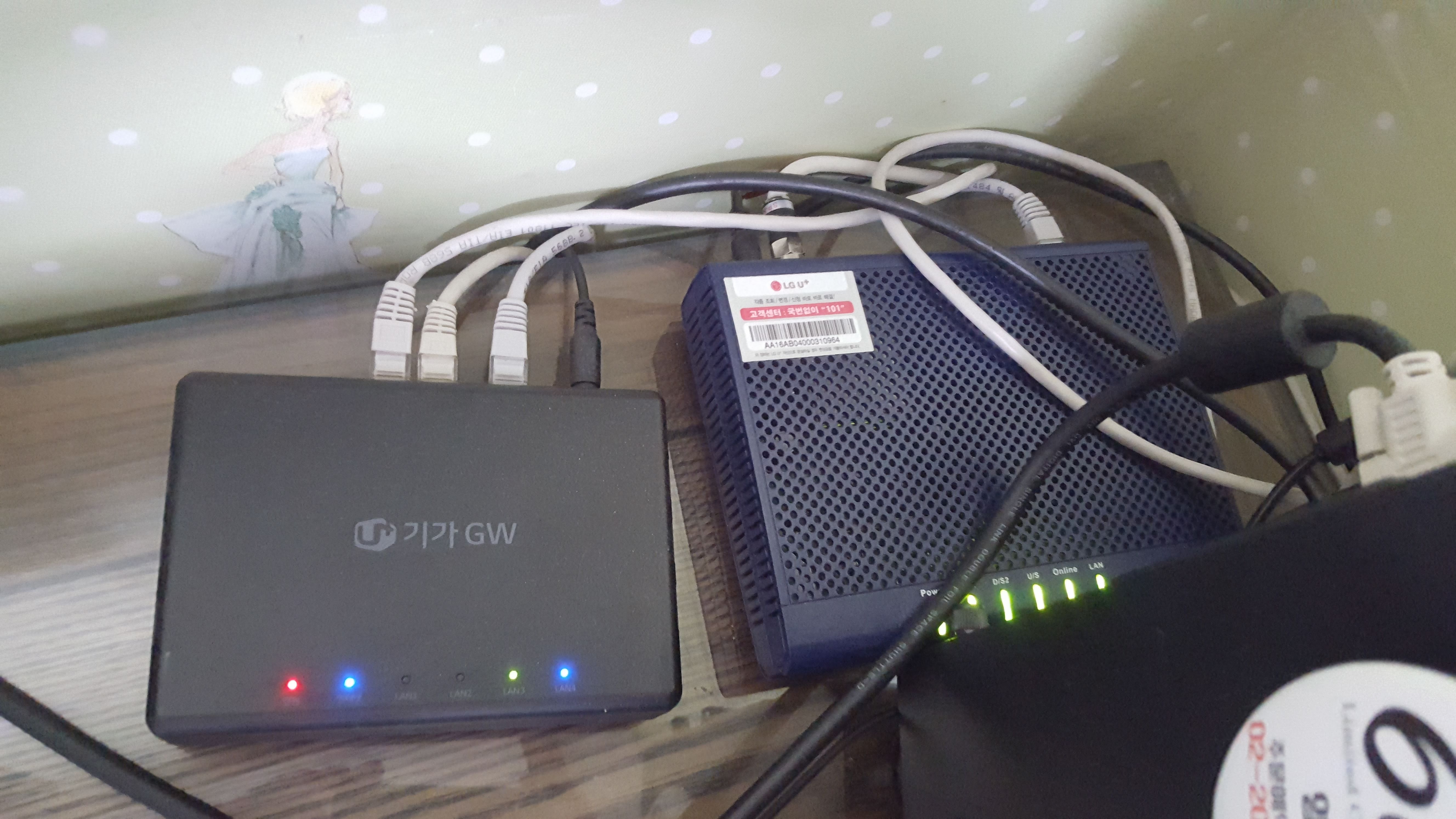 위 사진은 인터넷이 동축 케이블을 통해서 처음 들어오는 방2에 위치한 모뎀 (우측) + 공유기1 (좌측, 기가 GW)입니다. 옛날에 케이블 TV를 제공하는데 쓰였던 동축 케이블 망을 이용해서 인터넷을 제공하는 것으로, 광 케이블에 비하면 품질이 현저히 떨어집니다. 모뎀은 이런 동축 케이블 신호를 받아서 랜선을 이용하여 공유기1에 제공합니다.