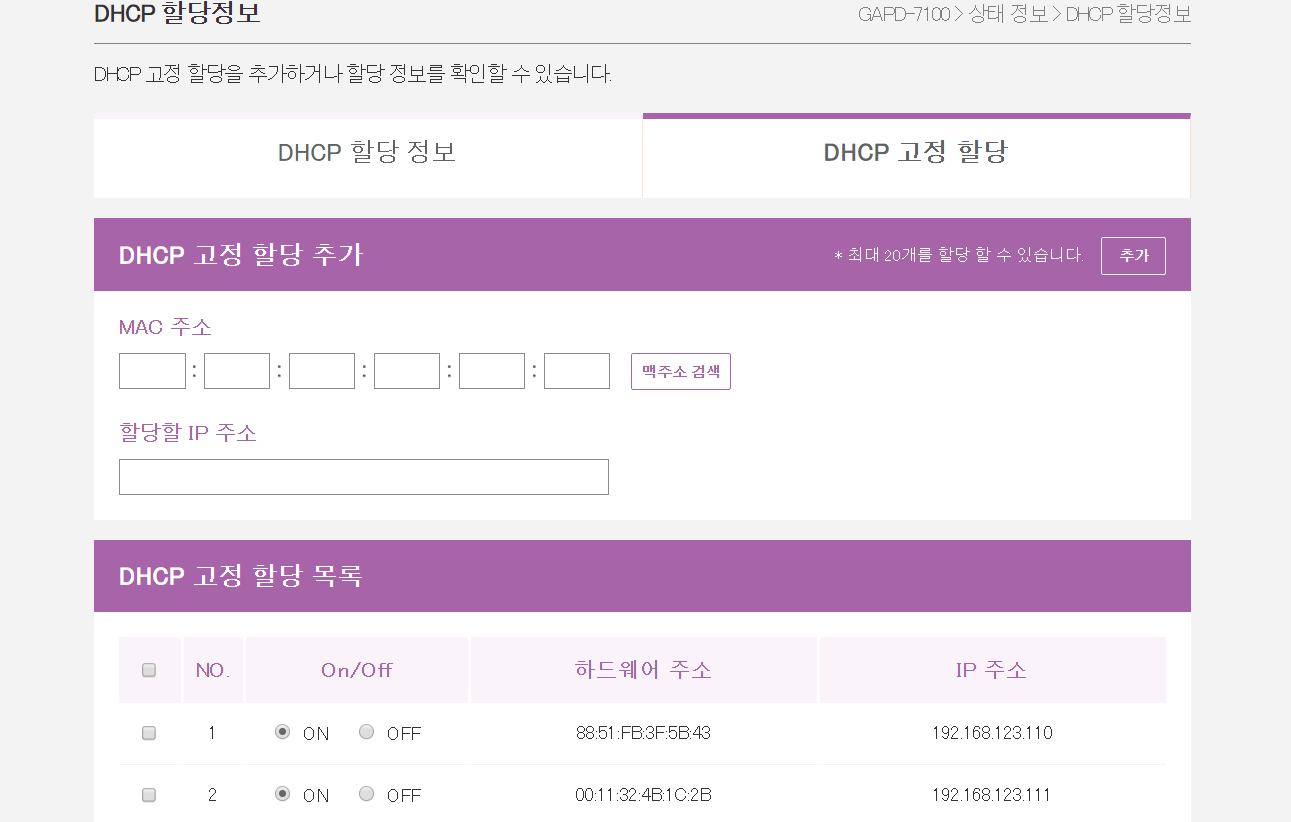 공유기2의 [상태 정보 > DHCP 할당정보]에 가서 [DHCP 고정 할당]을 들어갑니다.