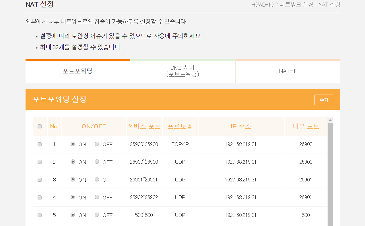 위가 공유기1이므로 위를 선택합니다. 아래는 공유기2입니다. 이제 [네트워크 설정 > NAT 설정]에서 포트 포워딩을 진행합니다. 저 위에 공유기2의 주소는 192.168.219.31로 되어 있습니다. 그러면 공유기1에서는 외부에서 들어온 인터넷 신호를 192.168.219.31 주소로 포워딩해주면 됩니다.