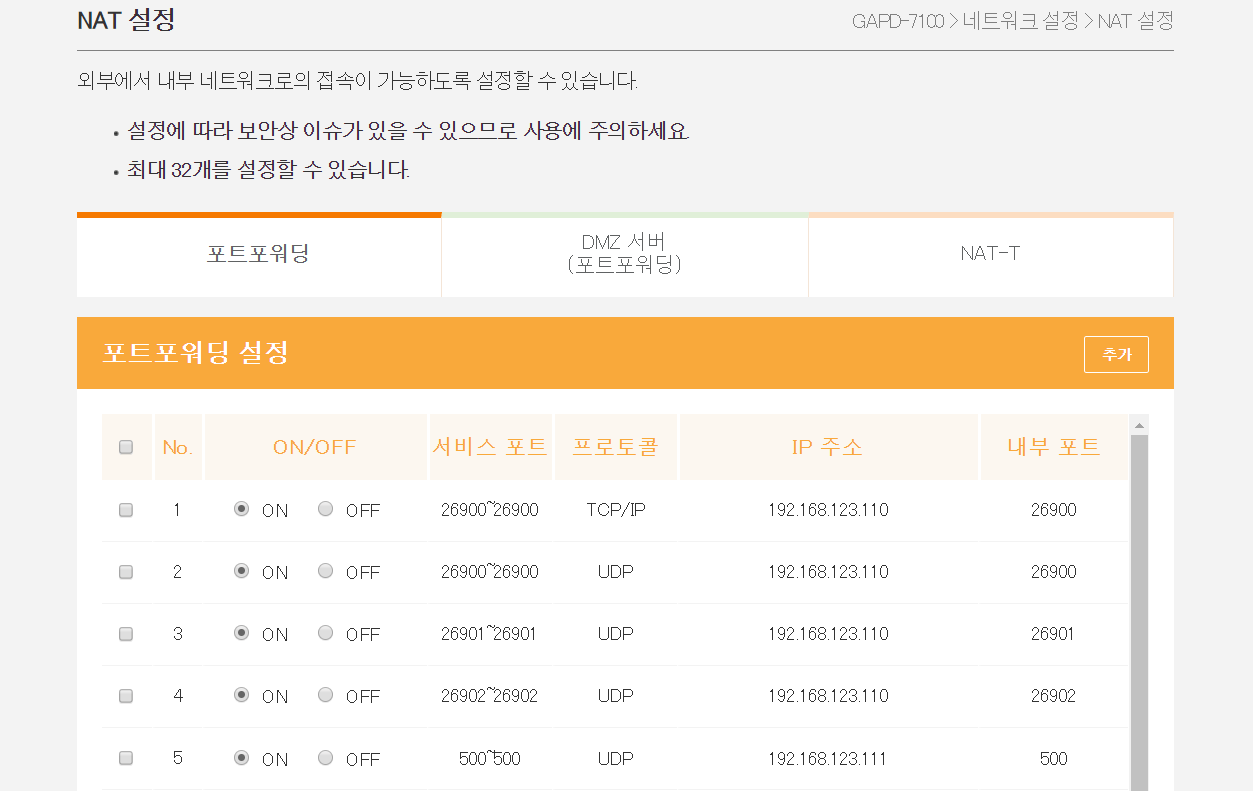 공유기1과 마찬가지로 [네트워크 설정 > NAT 설정] 메뉴에서 포트 포워딩을 진행합니다.