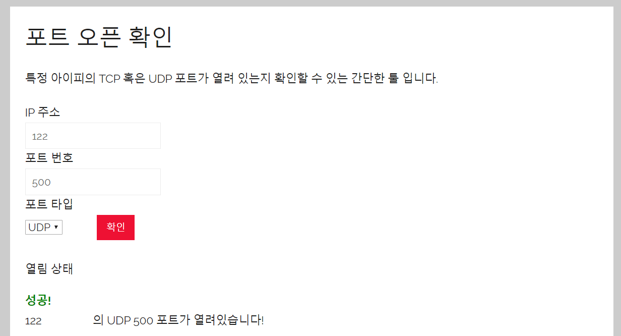 포트 오픈 확인 기능을 이용하여, 공인 IP와 포트 번호를 넣고 테스트를 해보면 아래와 같이 나타납니다.