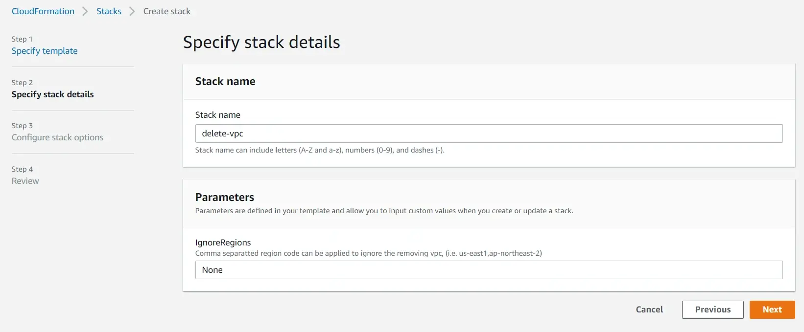 이름은 적당히 입력하면 됩니다. 해당 템플릿은 파라미터로 VPC를 삭제하지 않을 리전을 받고 있습니다. ,로 구분되는 리전 코드 (예: ap-northeast-2) 들을 제공하면 됩니다.