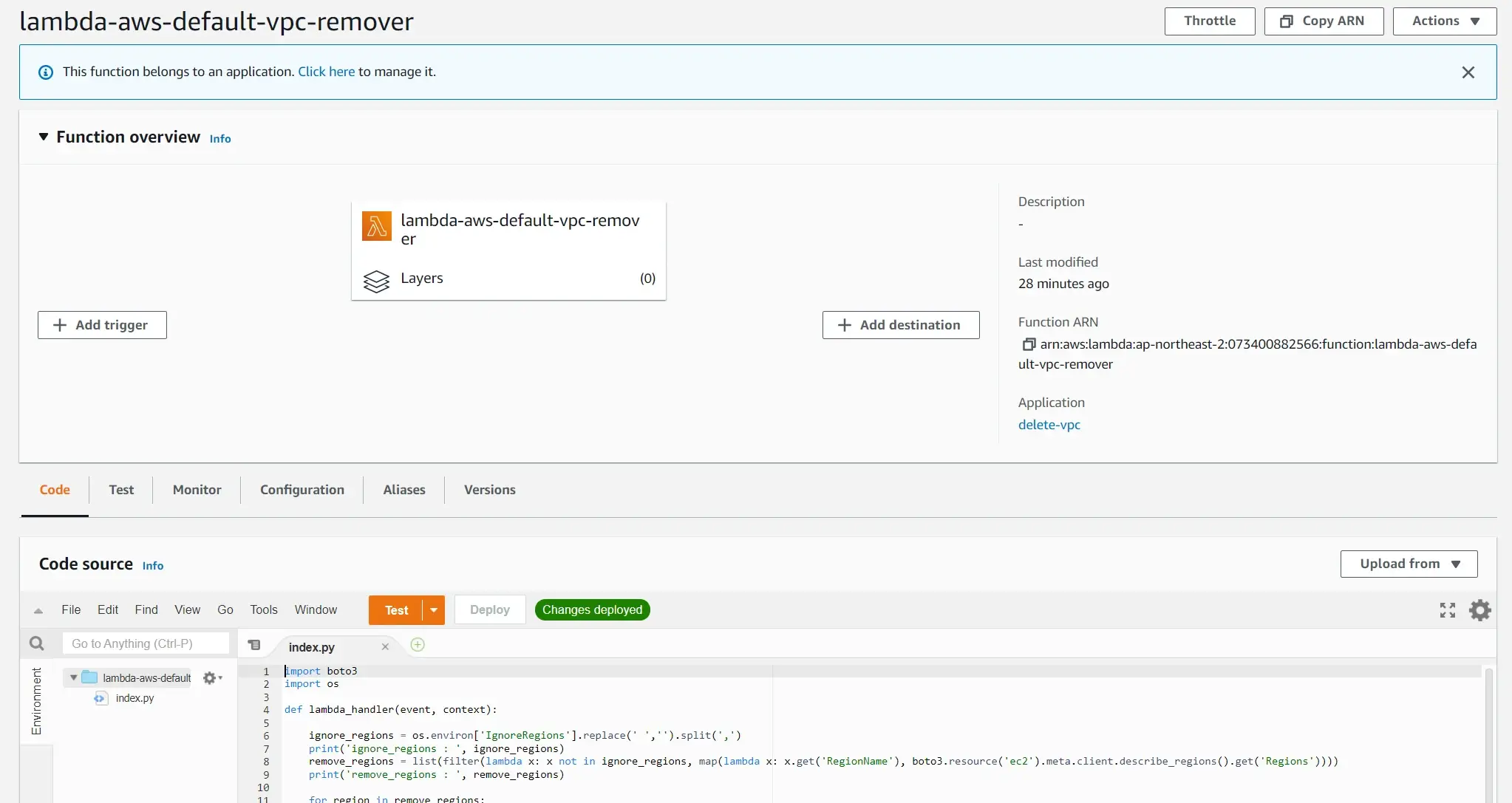 정상적으로 함수가 배포되었으면, Lambda의 함수 목록에서 lambda-aws-default-vpc-remover를 찾아볼 수 있습니다.