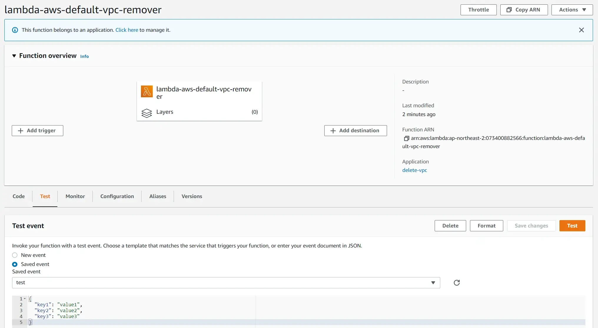 테스트 이벤트의 Payload는 특별한 값을 제공할 필요가 없습니다. 적당히 생성된 테스트 이벤트를 실행하면 약 2분에 걸쳐서 기본 VPC들을 삭제하게 되고, 아래와 같이 결과가 나타나게 됩니다.