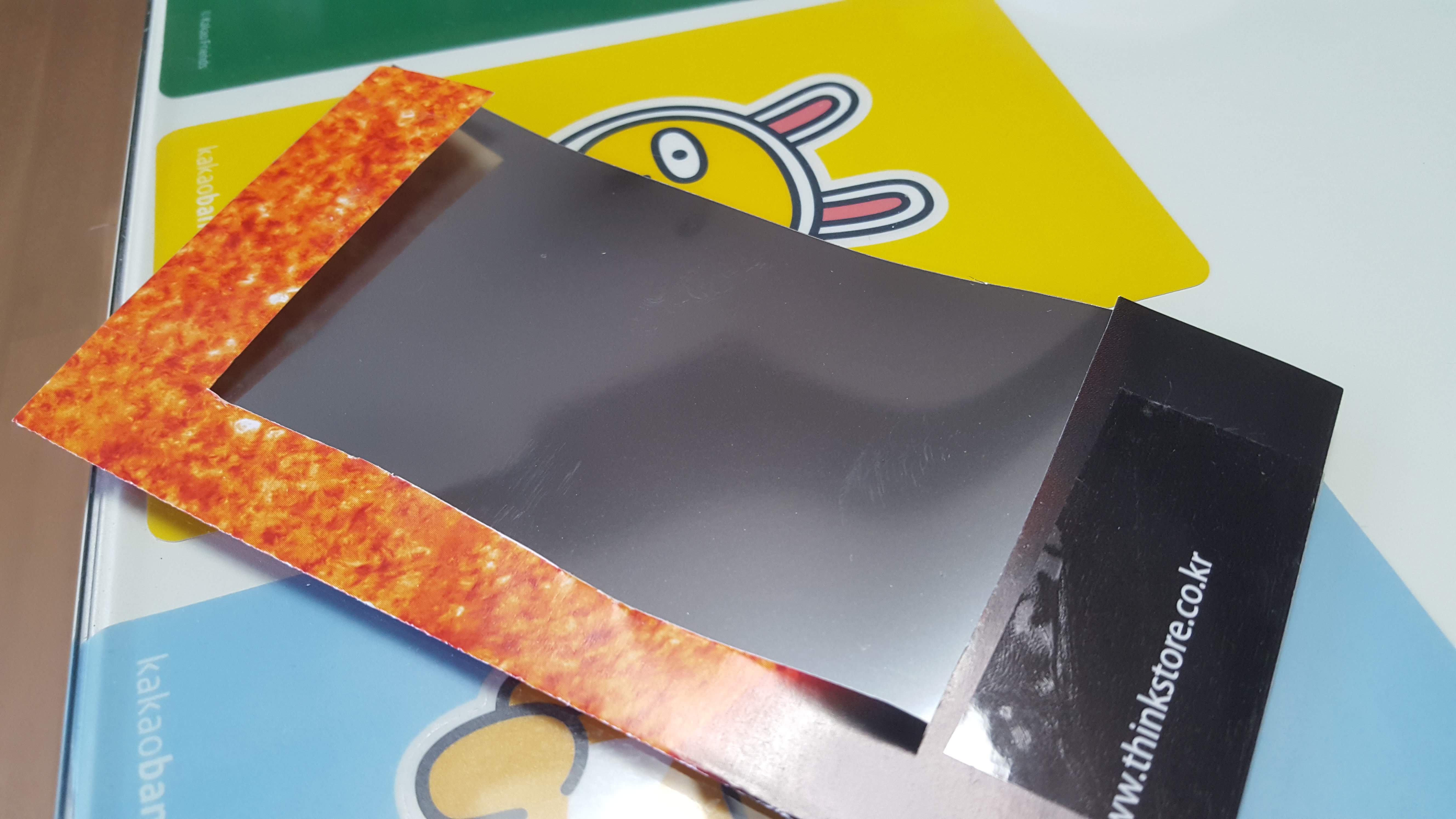 위 사진은 카메라에 쓸 필터 부분을 자르고 남은 짜투리 필름입니다. 그냥 눈으로 볼 때 쓰려고 양쪽을 손으로 잡을 수 있게끔만 만들었습니다. 카메라용은 더 웅장합니다!