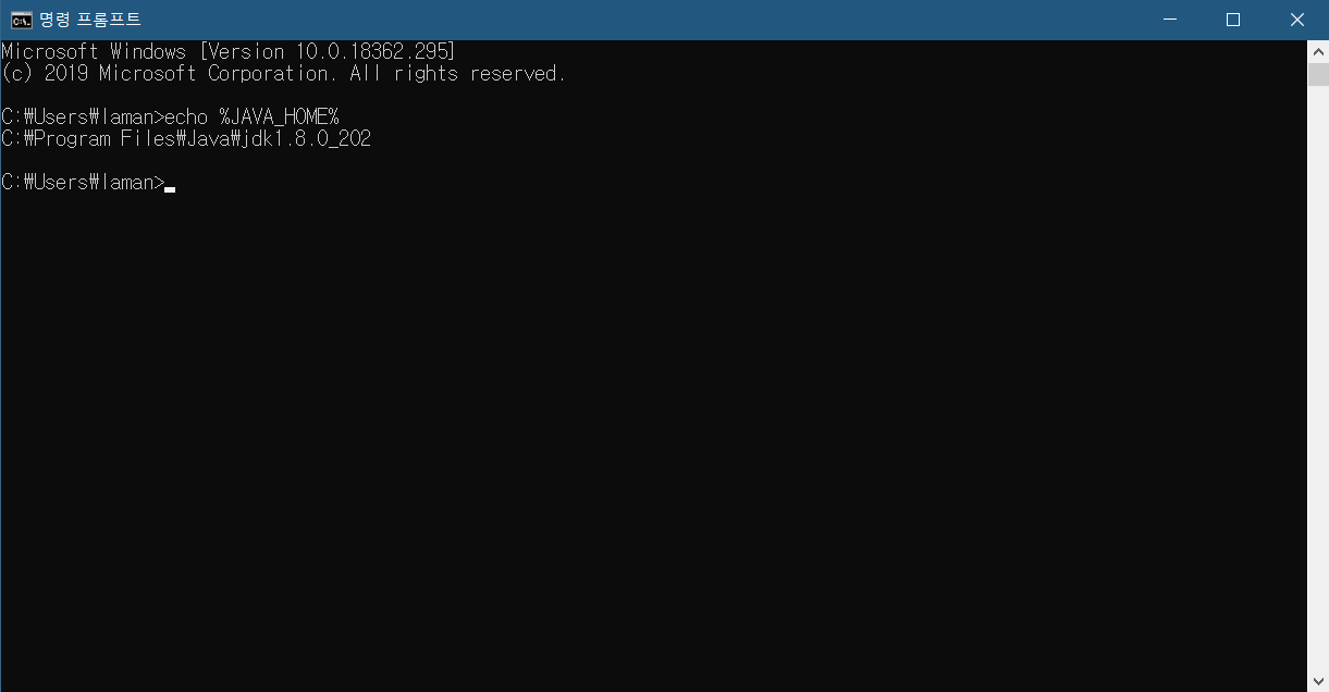 정상적으로 설치가 완료되었으면 위와 같이 자바 홈에 대한 환경 변수가 등록이 되어 있어야 합니다. 정상적으로 출력되지 않으면 아래에서 설명할 방법에 따라서 JAVA_HOME 환경 변수를 등록하시면 됩니다.