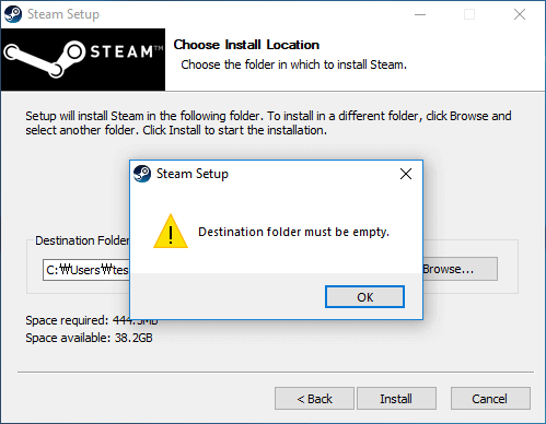 - 이것은 스팀을 설치하려는 폴더가 비어있지 않다는 뜻입니다.