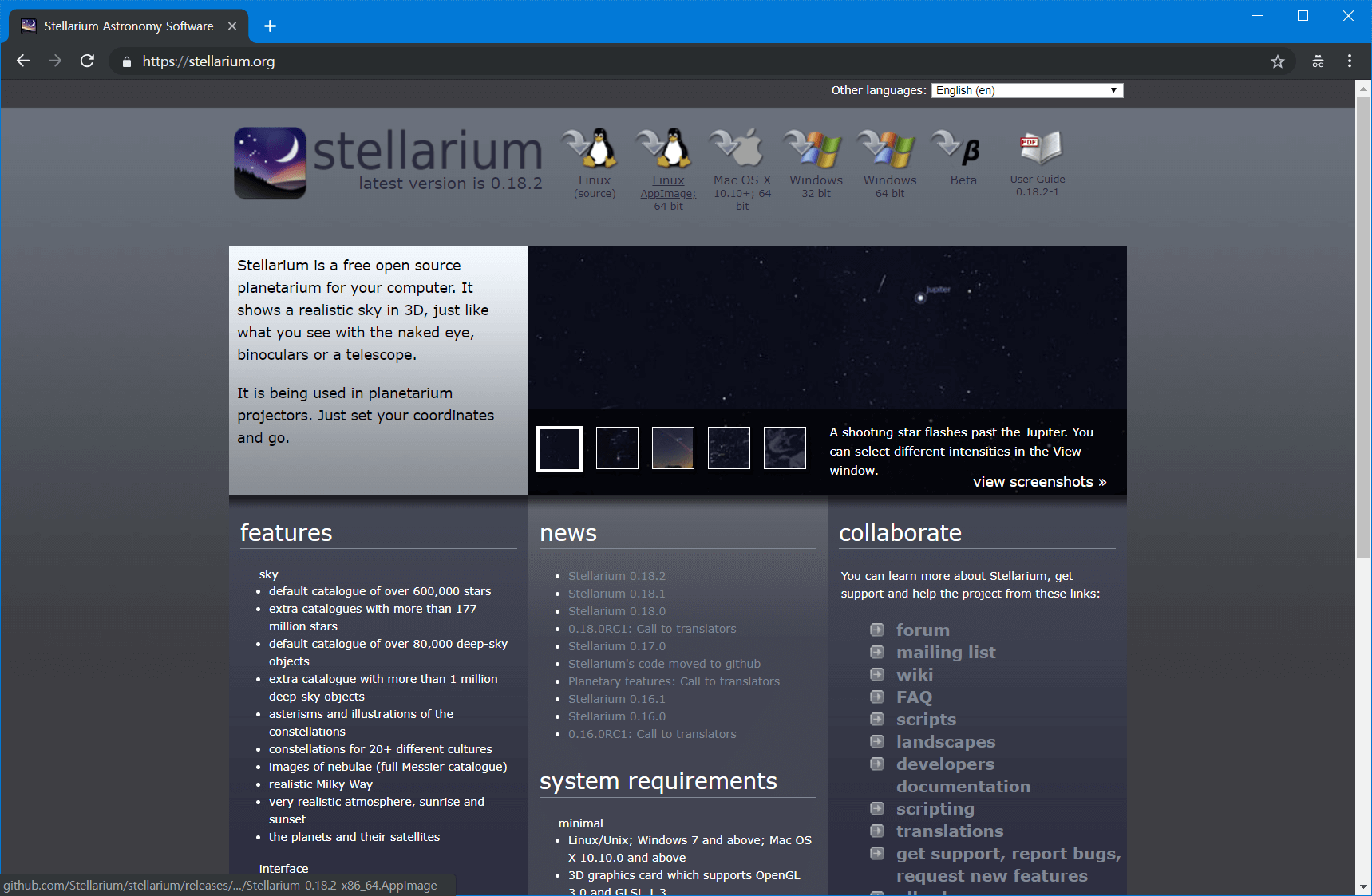 설치형을 알아보기 전에 먼저, 최근에 나온 스텔라리움 웹을 보도록 하겠습니다. 별도의 설치 없이도 별자리나 행성의 위치를 확인할 수 있습니다. [링크]