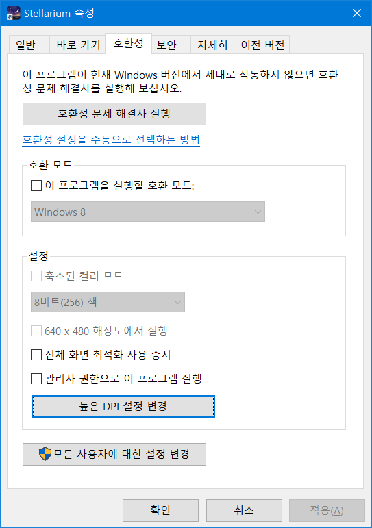 이제 시작 화면에서 스텔라리움을 우클릭하여 속성에 들어갑니다. [호환성] 탭에 보면 [높은 DPI 설정 변경]이라고 있습니다.