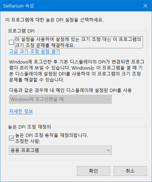 여기서 [높은 DPI 조정 재정의]를 체크하고 대상을 [응용 프로그램]으로 지정합니다. 이렇게 하면 윈도우에서 설정된 DPI 배율이 적용되지 않습니다. 이제 스텔라리움을 실행합니다.