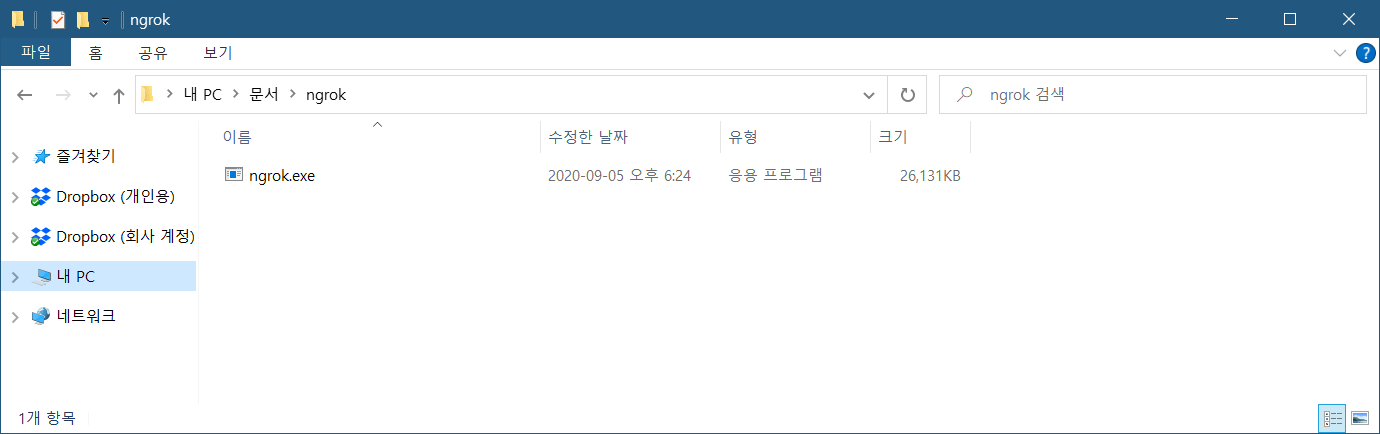[Download for Windows]를 눌러 파일을 다운로드 합니다. 압축되어 있는데, 압축을 해제하면 ngrok.exe 파일이 있을 겁니다. 이 파일을 별도의 폴더로 옮겨줍니다. 예를 들면, 내 문서에 ngrok 폴더를 만들어서 그 안에 놓으면 됩니다. 웹 페이지는 끄지 말고 그대로 둡니다.