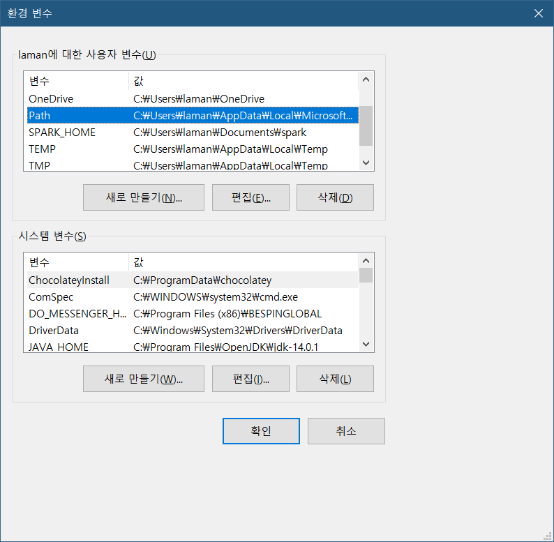 [시스템]의 좌측에서 [고급 시스템 설정 > 고급 > 환경 변수]에 들어가면 사용자 변수와 시스템 변수 두 개가 있는 것을 확인할 수 있습니다.