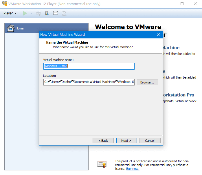 이제 생성할 가상 머신의 이름과 위치를 결정합니다. 저 같은 경우는 처음에 C 드라이브에 설치를 했다가 용량 문제로 D 드라이브로 옮겼습니다. 미리 잘 정하시길 바랍니다.