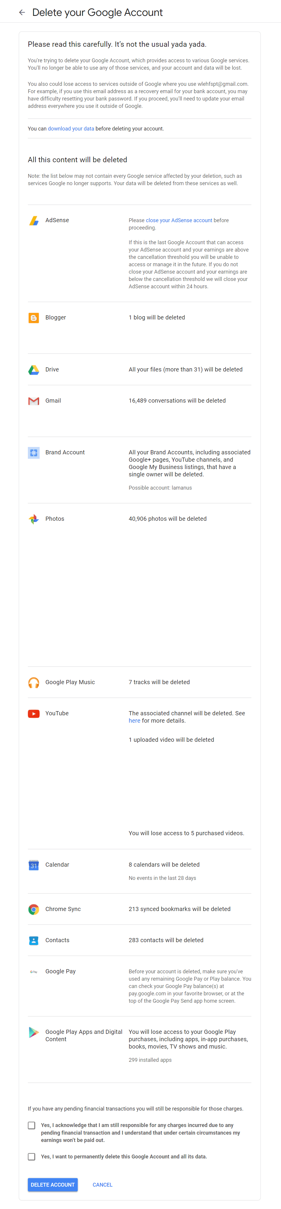 구글 계정의 삭제는 아래 링크를 통해서 진행할 수 있습니다. 계정 삭제를 진행하면 무슨 일이 생기는지 친절히 경고를 해줍니다. 한마디로, 구글 계정 내의 모든 항목이 삭제됩니다.